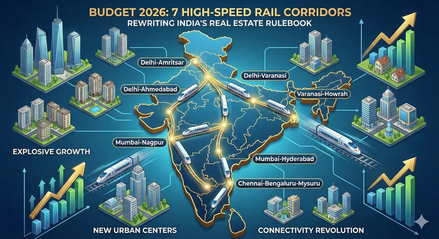 The Union Budget 2026 has unveiled seven transformative high-speed rail corridors, aiming to condense travel times between India's major economic hubs like Mumbai, Pune, Hyderabad, and Bengaluru. This infrastructure push is set to redefine the real estate landscape, turning peripheral towns into prime investment hotspots and creating new "megaregions" across the country.
