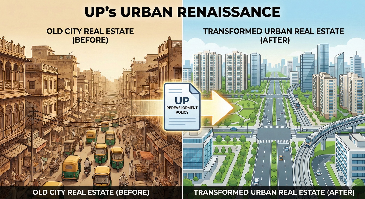 Uttar Pradesh’s new Urban Redevelopment Policy 2026 targets buildings aged 25 years or older for demolition and modern reconstruction, incentivizing private developers with higher Floor Area Ratios (FAR) and mixed-use permits. This initiative aims to revitalize decaying core city areas, improve urban density, and offer safe, modern housing without displacing residents to the outskirts.