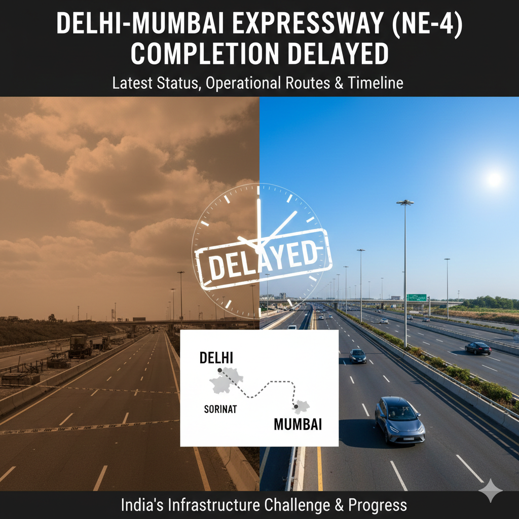 The full completion of the Delhi-Mumbai Expressway (NE4) has been officially pushed to late 2027 due to pending construction in key Gujarat sectors. While major stretches like Sohna-Dausa and Vadodara-Bharuch are already operational, the final link to Mumbai awaits the resolution of critical bottlenecks.