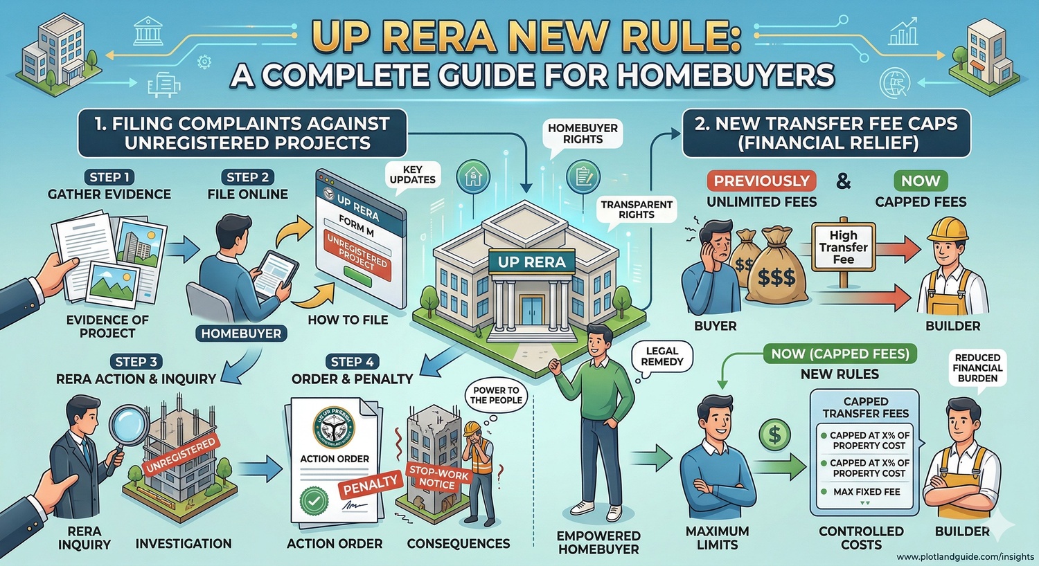 The Uttar Pradesh Real Estate Regulatory Authority has officially amended its rules to allow homebuyers to file grievances against unregistered projects, closing a major legal loophole. Additionally, the authority has introduced strict financial caps on property transfer charges, providing massive relief to property owners and heirs.